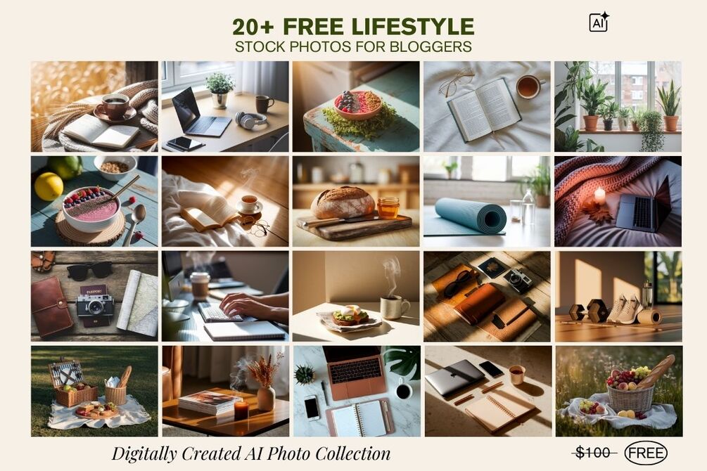 Upgrade your blog and social media with this free pack of 20 lifestyle stock photos. Each image is AI-digitally created, ultra-realistic, and high-resolution — perfect for bloggers, content creators, and small business owners.